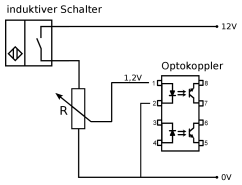 Da die Schrittmotorkarte nur mechanische Endschalter unterstützt, ließen sich die induktiven Endschalter nicht ohne weiteres nutzen. Um die induktiven Endschalter nutzen zu können, musste die Spannung über einen Spannungsteiler heruntergesetzt werden und die standardmäßigen Eingänge für die mechanischen Endschalter umgangen werden. Die induktiven Endschalter werden direkt an den Optokoppler angeschlossen, welcher für die mechanischen Endschalter zuständig ist. Dadurch wurden die Signale der Endschalter für die Schrittmotorkarte nutzbar.